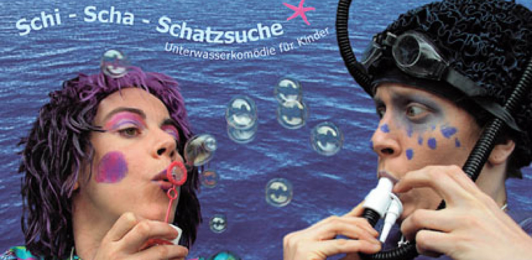 Die Unterwasserkomödie „Schi – Scha – Schatzsuche“ ist das Sommerstück in unserem Vier – Jahreszeiten – Zyklus. Es ist eine Phantasiereise, lebendig, clownesk und bunt für Kinder ab 2 Jahren (Dauer 45 min). Alles was wir brauchen, bringen wir mit. Ein kleines, buntes Gumiboot ist unsere Bühne. Dafür benötigen wir eine Fläche von ca. 3 x 4 Metern. Besondere technische Vorausetzungen sind nicht erforderlich, deshalb auch ideal für Open-Air-Veranstaltungen. Im Anschluß an die Vorstellung kann ein Kinderschminken zu Seeungeheuern und Meerestieren gebucht werden.